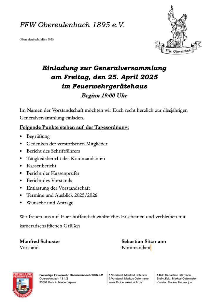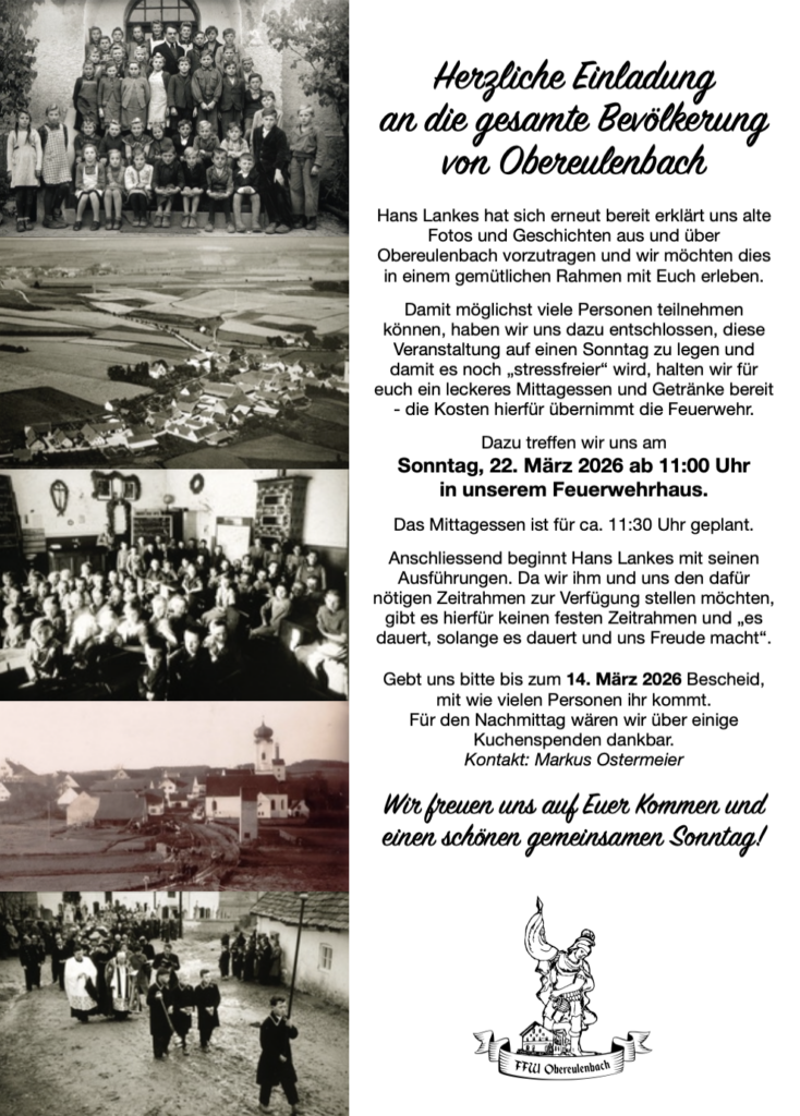 Hans Lankes hat sich erneut bereit erklärt uns alte Fotos und Geschichten aus und über Obereulenbach vorzutragen und wir möchten dies in einem gemütlichen Rahmen mit Euch erleben.