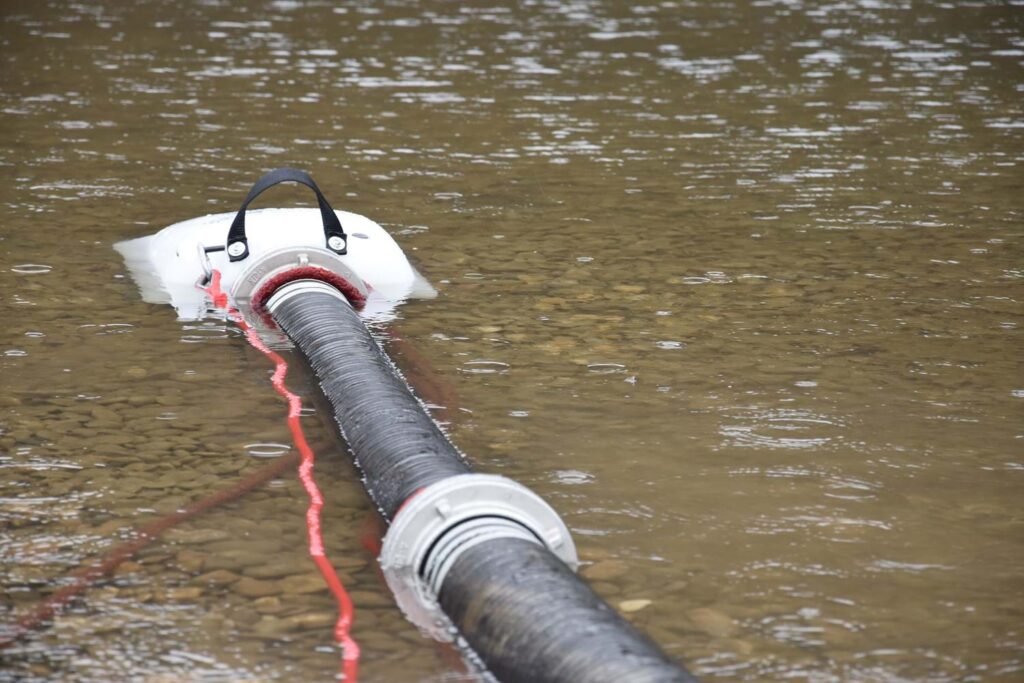 „Schwimmsauger sind spezielle Saugkörbe, die auf der Wasseroberfläche schwimmen können und es den Einsatzkräften ermöglichen, Wasser auch aus sehr seichten Gewässern zu entnehmen. Somit können Schwimmsauger verwendet werden, um Brände zu bekämpfen und gleichermaßen auch, um unter Wasser stehende Keller auszupumpen.“