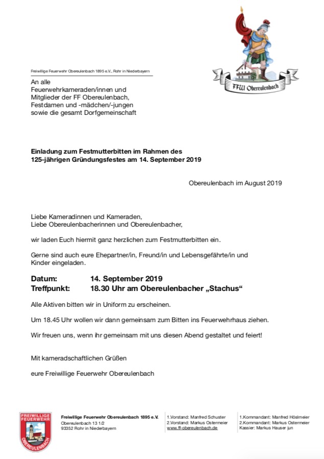 Einladung zum Patenbitten bei der Feuerwehr Rohr